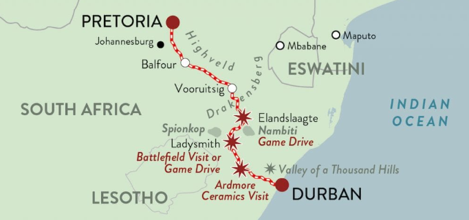 Start från Durban Station. Utforska stadens många charmiga drag, inklusive museer, kulturella sevärdheter och vackra botaniska trädgårdar. Tåget tar dig genom den imponerande "Valley of a Thousand Hills". Gästerna kan fräscha upp sig i sina sviter och koppla av i loungen och observationsvagnen. En läcker lunch serveras i matsalsvagnarna. Besök det berömda Ardmore Ceramics Gallery och njut av konst inspirerad av naturen och zulufolktro. Middagen avnjuts i matsalsvagnarna på väg till Ladysmith. Klädkod: Formell.