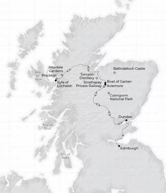 Resan tar dig genom uråldriga landskap, från Edinburgh till Kyle of Lochalsh och Aviemore. Upplev Highland-kulturen, besök historiska platser som Tomatin Destilleri och Ballindalloch Castle och njut av underhållning ombord. Med maximalt 38 gäster är det en intim resa där du skapar magiska minnen samtidigt som du fördjupar dig i Skottlands rika arv. Royal Scotsman erbjuder dig en perfekt blandning av lyx och äventyr!